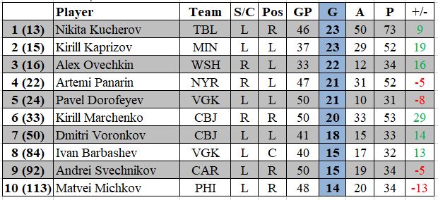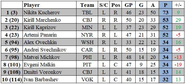 В топ-50 всей лиги располагается 4 российских форварда (Кучеров, Марченко, Капризов, Панарин).