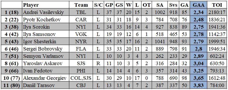 По коэффициенту надежности первое место среди наших вратарей также занимает Андрей Василевский с 2.34. Вторым идет Петр Кочетков с 2.48, третье место занимает Илья Сорокин с 2.75.