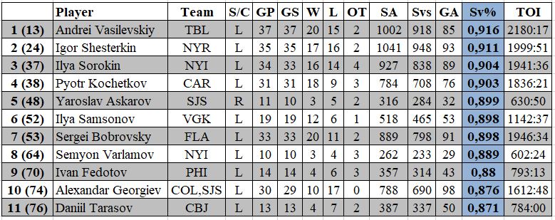 По проценту отраженных бросков на первое место снова вышел Андрей Василевский, который имеет 91.6 % в 37 матчах.