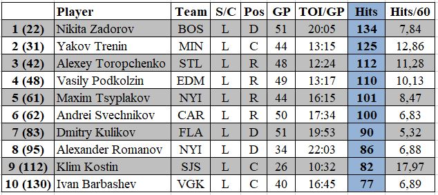 По количеству силовых приемов на 60 минут пятерка лидеров среди россиян выглядит следующим образом (среди игроков, сыгравших более 10 матчей): 1) Клим Костин 17.97 (82 силовых приема в 26 матчах); 2) Яков Тренин 12.86 (125 в 44); 3) Алексей Торопченко 11.28 (112 в 48); 4) Василий Подколзин 10.13 (110 в 49); 5) Иван Мирошниченко 9.99 (28 в 18).