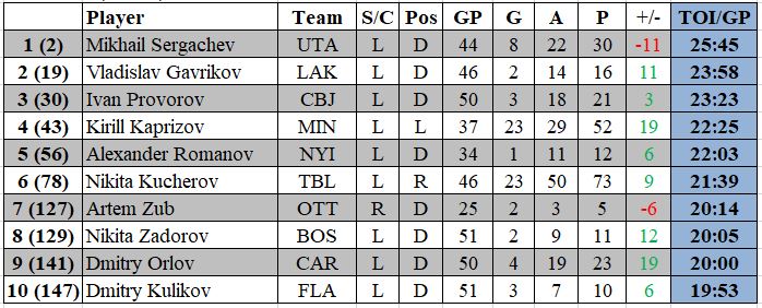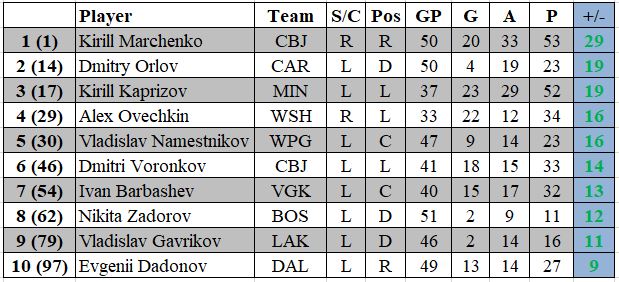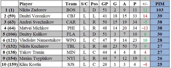 Худшие по показателю полезности среди россиян: Евегний Малкин «-19» (47 матчей, среднее игровое время 18:03); Матвей Мичков «-13» (48 матчей, среднее время на льду 16:14) и Михаил Сергачев «-11» (44 матча, среднее игровое время 25:45).