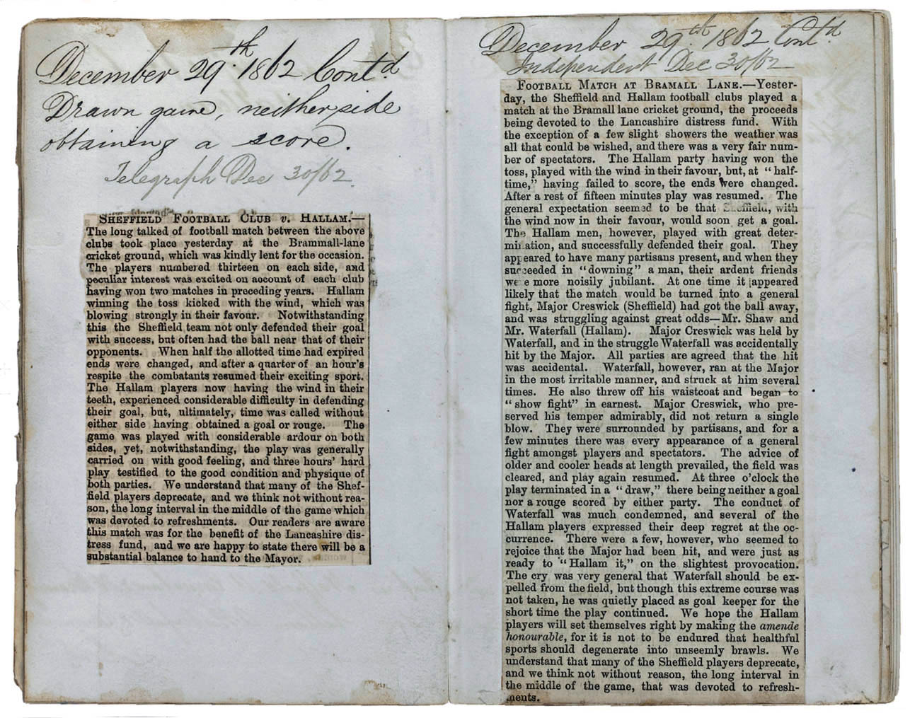 Клуб, созданный специально для противостояния с шеффилдскими футболистами, встретился со своим соперником уже через три месяца после основания, да и еще в какой день! Не успели отгреметь рождественские пиршества, а спортсмены уже решительно готовились к исторической битве на том самом «Сэндигейт», где и по сей день выступает»Халлам». Ни протокола, ни естественно, каких-то фотосъемок с той встречи нет. Даже если они и существовали, то или бесследно исчезли под слоем истории, то ли где-то тщательно скрыты от глаз обывателей, но известно точно, что матч тот назвать обычным по сегодняшним меркам сложно в силу некоторых особенностей.