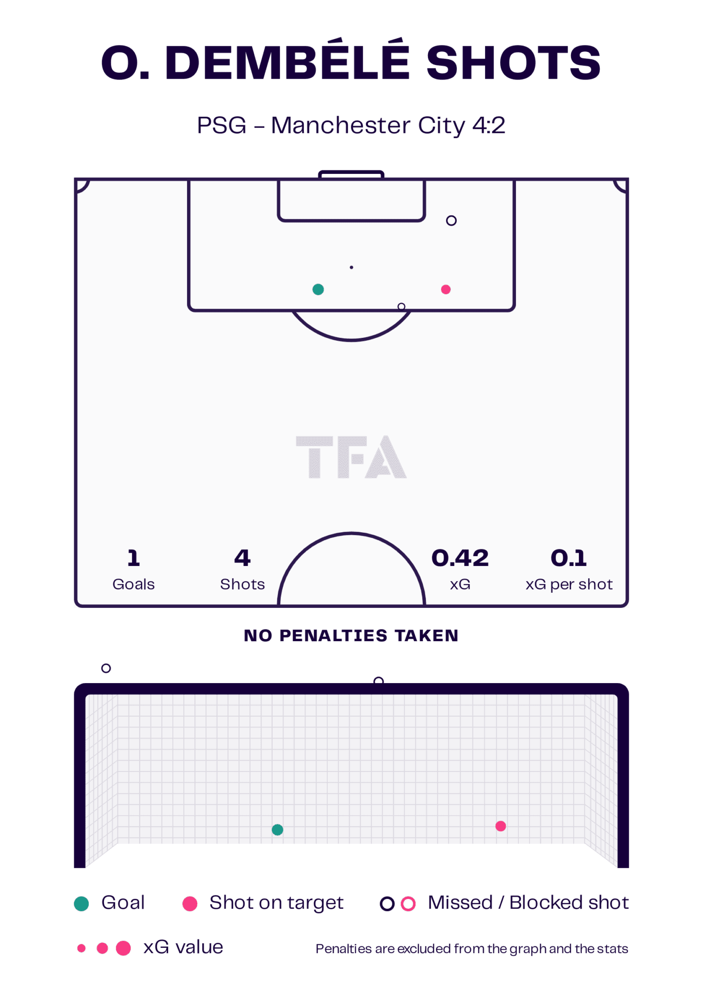 Напротив, «ПСЖ» с трудом находили свой ритм в первом тайме. «Манчестер Сити» переигрывали их тактически, и, по-видимому, у «ПСЖ» не было четкого плана игры. Парижане не смогли создать явных моментов и в основном ограничивались дальними ударами, с которыми справлялась защита «Сити». Полузащита «ПСЖ» с трудом конкурировала с горожанами, что еще больше усугубило проблемы. Команда из Франции выглядела разрозненной, у неё не получалось закрепиться в игре. Они не могли найти варианты в атаке, чему препятствовала уверенная оборонительная структура «Манчестер Сити», они не смогли создать явные возможности для взятия ворот. «ПСЖ» в первом тайме были тенью команды, которая появится во втором тайме.