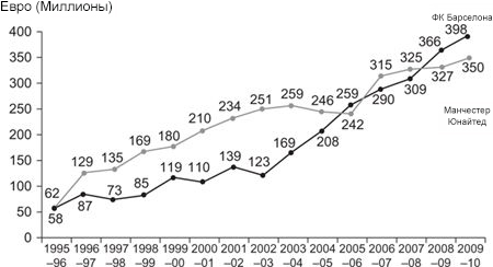 Рисунок 2.5 Доходы: «Манчестер Юнайтед» и «Барселона» (1995-2010)