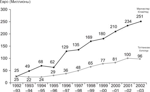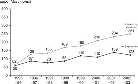 Аналогичные аргументы можно привести, сравнив доходы «Манчестер Юнайтед» и «Барселоны» в период между сезоном 1995/96 и сезоном 2002/03 (рис. 2.4).