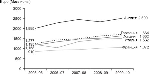 На вопрос о том, какая лига является лучшей в мире, можно дать множество ответов, в зависимости от индивидуальных предпочтений болельщика, но с экономической точки зрения существует только один правильный ответ. Премьер-лига — это лучший футбольный рынок в мире, который значительно превосходит четыре других крупных мировых рынка: Испания, Италия, Германия и Франция. Взгляните на рисунок 2.1.