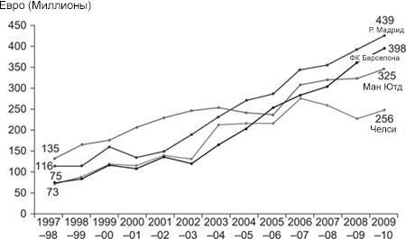 Рисунок 2.6 Доход: «Манчестер Юнайтед», «Барселона», «Реал Мадрид» и «Челси» (1997-2010)