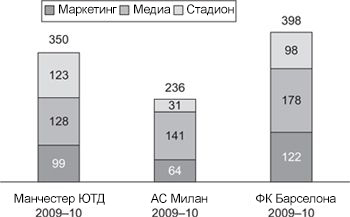На рисунке 2.8 «Милан» выделяется тем, что его доходы от стадиона очень низкие по сравнению с двумя другими клубами. Это касается и «Ювентуса», и других итальянских клубов, потому что в Италии большинство стадионов принадлежит местным властям, а инвестиции в них очень малы по сравнению со стадионами в других странах. Здесь меньше зрителей («Ювентус» в среднем собирает 20 000 зрителей за матч), и стадионы эксплуатируются менее интенсивно. В отличие от этого, «Манчестер Юнайтед» регулярно заполняет свой стадион «Олд Траффорд» на 68 000 человек, а в 2006 году решил увеличить его вместимость до 76 212 человек. Стадион футбольного клуба «Барселона» вмещает 98 000 зрителей и в среднем собирает более 75 000 человек.