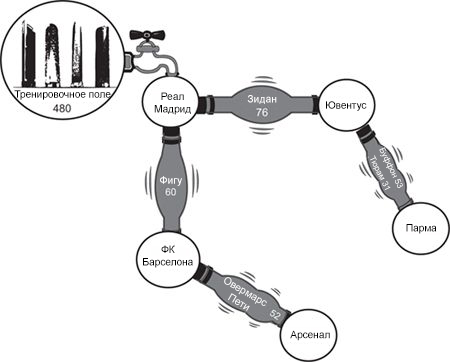 И снова, как и в случае с Абрамовичем, в игру вступили деньги не из футбольной индустрии, что привело к инфляции. Хорошими примерами являются случаи с Фигу и Зиданом. Большая часть из €60 млн., которые Жоан Гаспар заплатил «Барселоне» за трансфер португальца, попала в казну «Арсенала» в обмен на игроков Овермарса и Пети. «Ювентус» использовал €76 млн., полученных за Зидана, чтобы подписать Буффона и Тюрама из «Пармы». Роберто Беттега, вице-президент «Ювентуса» в то время, рассказал мне, как трудно было договориться с «Пармой» о хорошей цене на вратаря Буффона и защитника Тюрама, ведь с самого начала все знали, что «Ювентус» держит в кармане €76 млн., которые «Мадрид» заплатил за Зидана. Сумма, которую «Ювентус» заплатил за Буффона, превысила все предыдущие расходы на вратаря — €53 млн. Еще €31 млн. был заплачен за Тюрама. Эта безумная инфляция распространяется по всей цепи (рис. 2.7).
