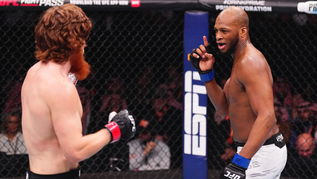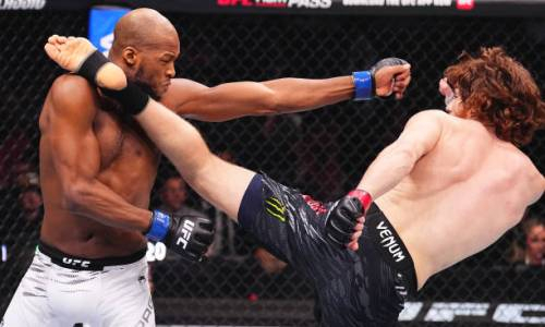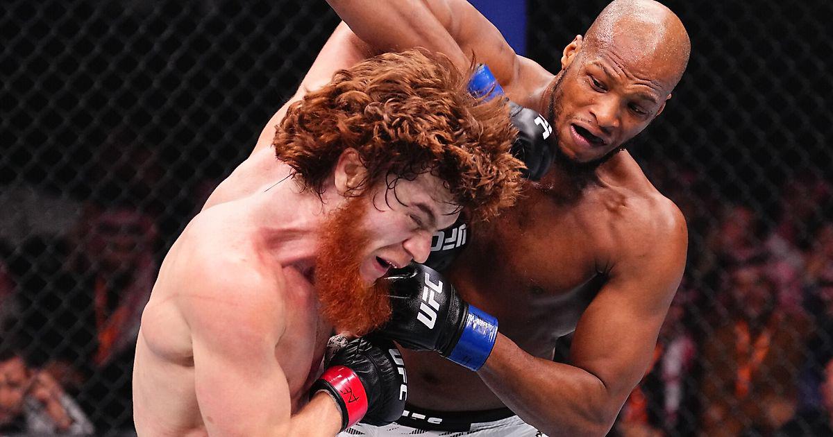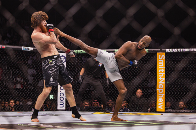 - 10 секунд до конца первого раунда: ловит на неудачном супермене, оттесняет к сетке, бьет правым хай-киком и бросает бэкфист по воздуху. Зачем именно это? Все отлично знают про его любовь к бэкфистам.