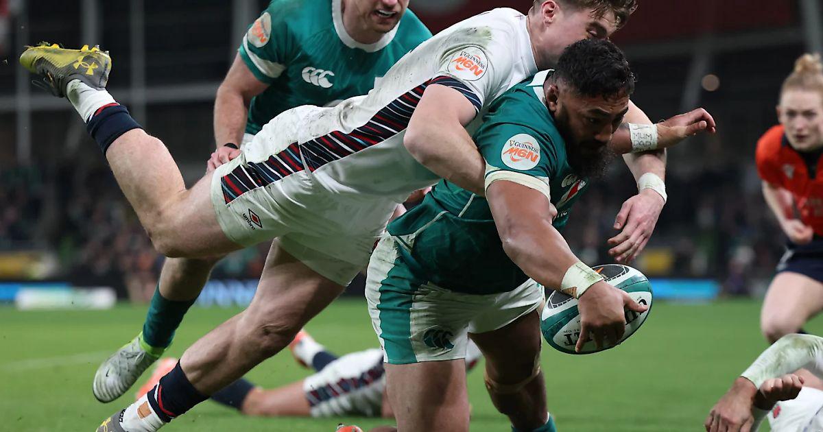 Ирландцы продолжили атаковать, гонимые родными трибунами и вынудили автора первой попытки в этом матче Кадена Марли (11 номер) ошибиться после ловли мяча в своей зачетке. Джеймс Лоу (11 номер) и Хьюго Кинан (15 номер) налетели на молодого игрока и буквально вынесли Марли с мячом за пределы поля и заработали аут вблизи зачетной зоны англичан для своей команды. Только вот четвертую попытку ирландцы занести не смогли, потеряв мяч в раке.