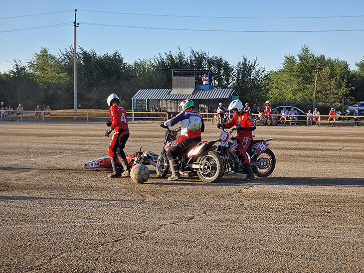 Это очень странная, какая-то противоестественная игра, почти как знаменитая ритуальная игра с мячом древних ацтеков. Потому что трудно придумать что-то менее естественное и органичное, чем пытаться что-то сделать с мячом ногой в процессе езды на мотоцикле. Но при этом игра очень притягательная. Почему-то смотришь на это вроде бы не слишком красивое зрелище, и не можешь оторваться. И жалеешь, что закончилось. Дико, странно, круто, прекрасно.