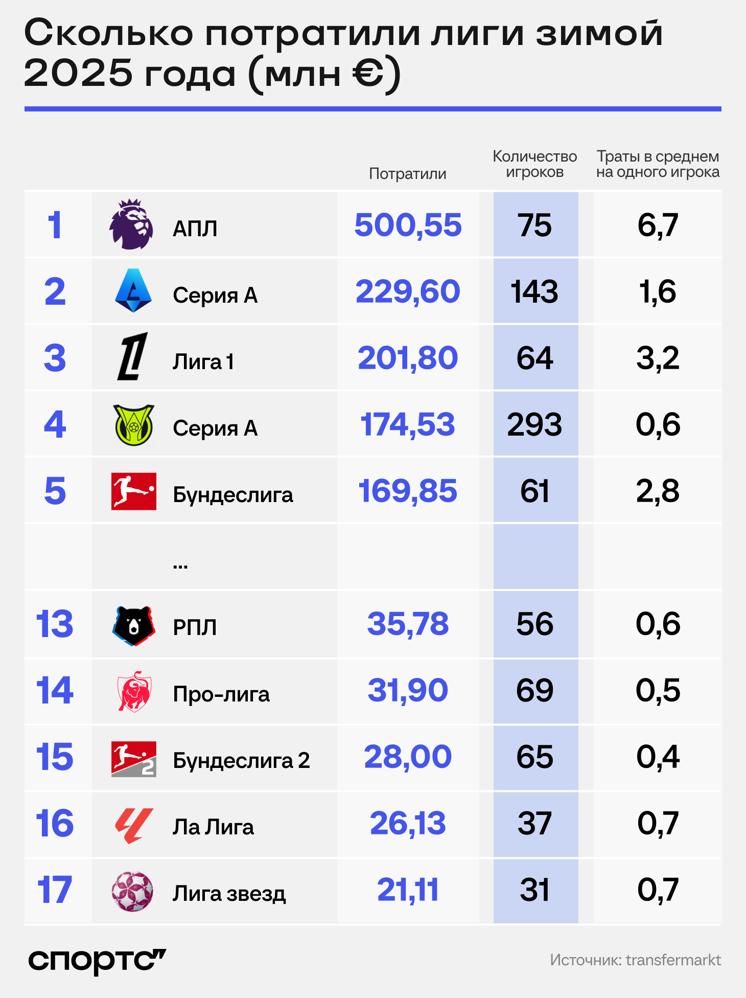 В заголовке нет ошибки: суммарно клубы Ла Лиги за зимнее окно отдали на новичков всего 26 млн евро. Сравнивать с другими чемпионатами бессмысленно. Впереди многие, включая РПЛ.