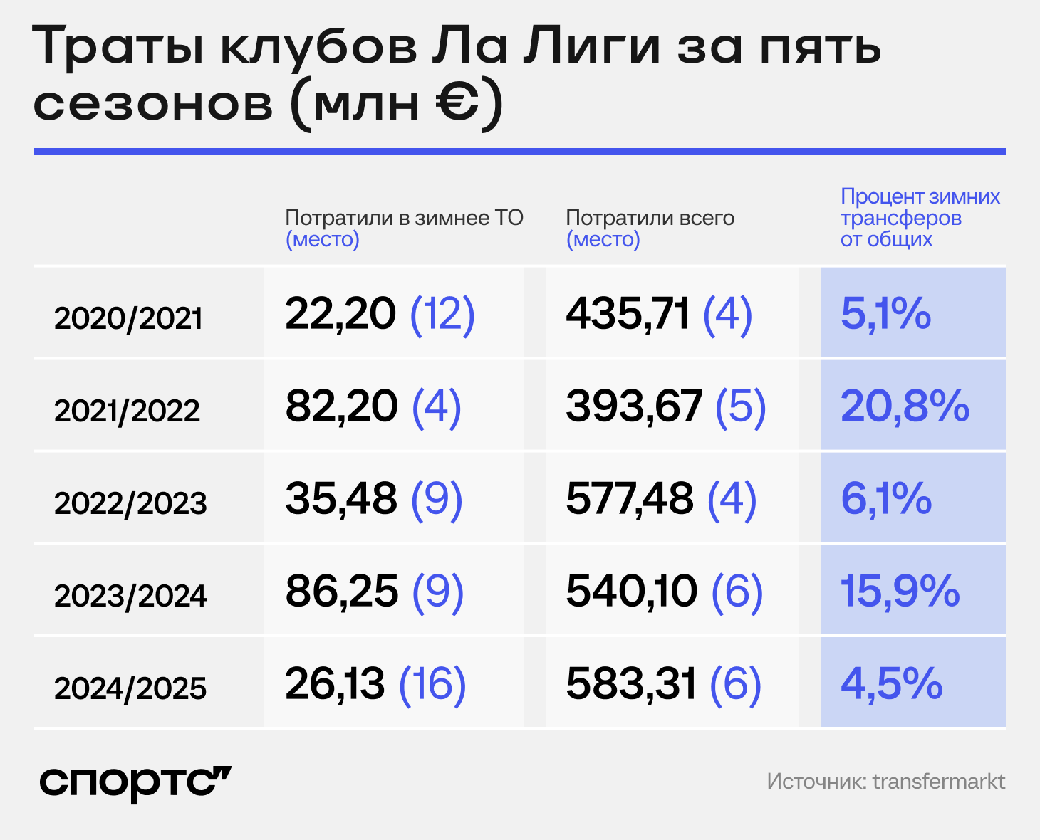 Вообще, испанцы всегда мало тратили в январе – только в сезоне-2021/22 залетали в топ-4, когда футбол еще восстанавливался от ковидных потерь.