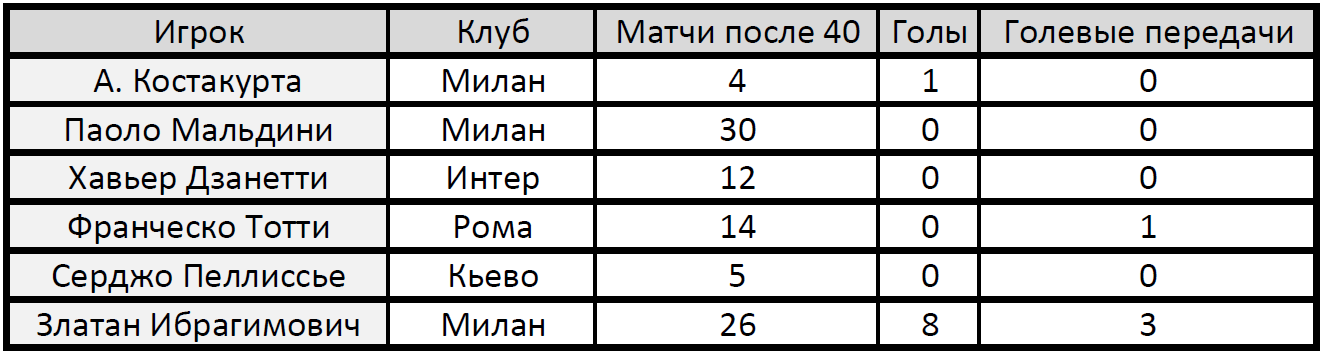 Паоло Мальдини и Алессандро Костакурта — без малого 1600 матчей на двоих за «Милан» и 200 за сборную Италии. Семь чемпионств в Италии и пять в главном еврокубке. После достижения 40 лет Костакурта провел 4 матча в Серии A и 1 — в Лиге чемпионов, а Мальдини сумел отыграть целый сезон, оставаясь основным игроком команды.