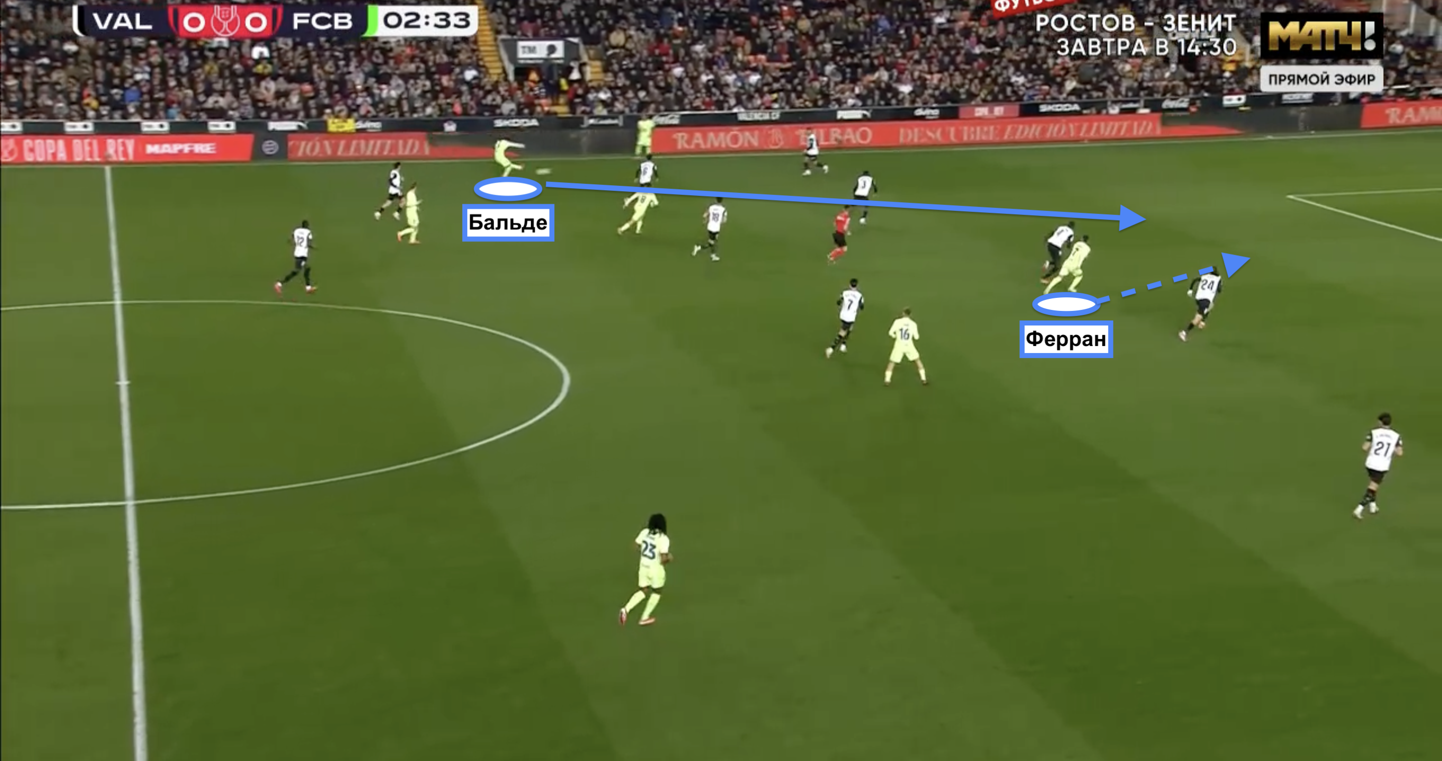В четвертом голе «Барселоны», в третьем для Феррана Торреса, ярко бросилось в глаза пассивность опорных полузащитников «Валенсии» при передачи мяча Педри в атакующую линию каталонцев уже из левосторонней зоны оборонительного блока «летучих мышей».