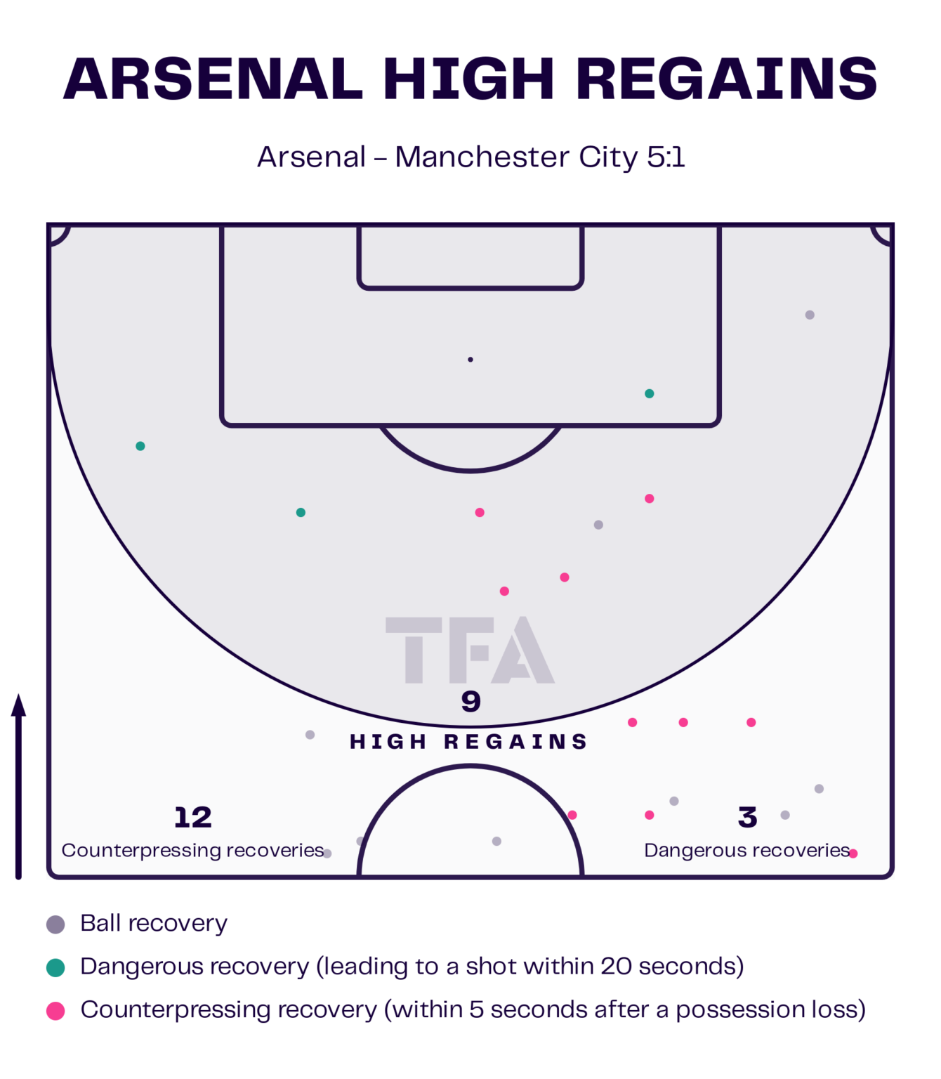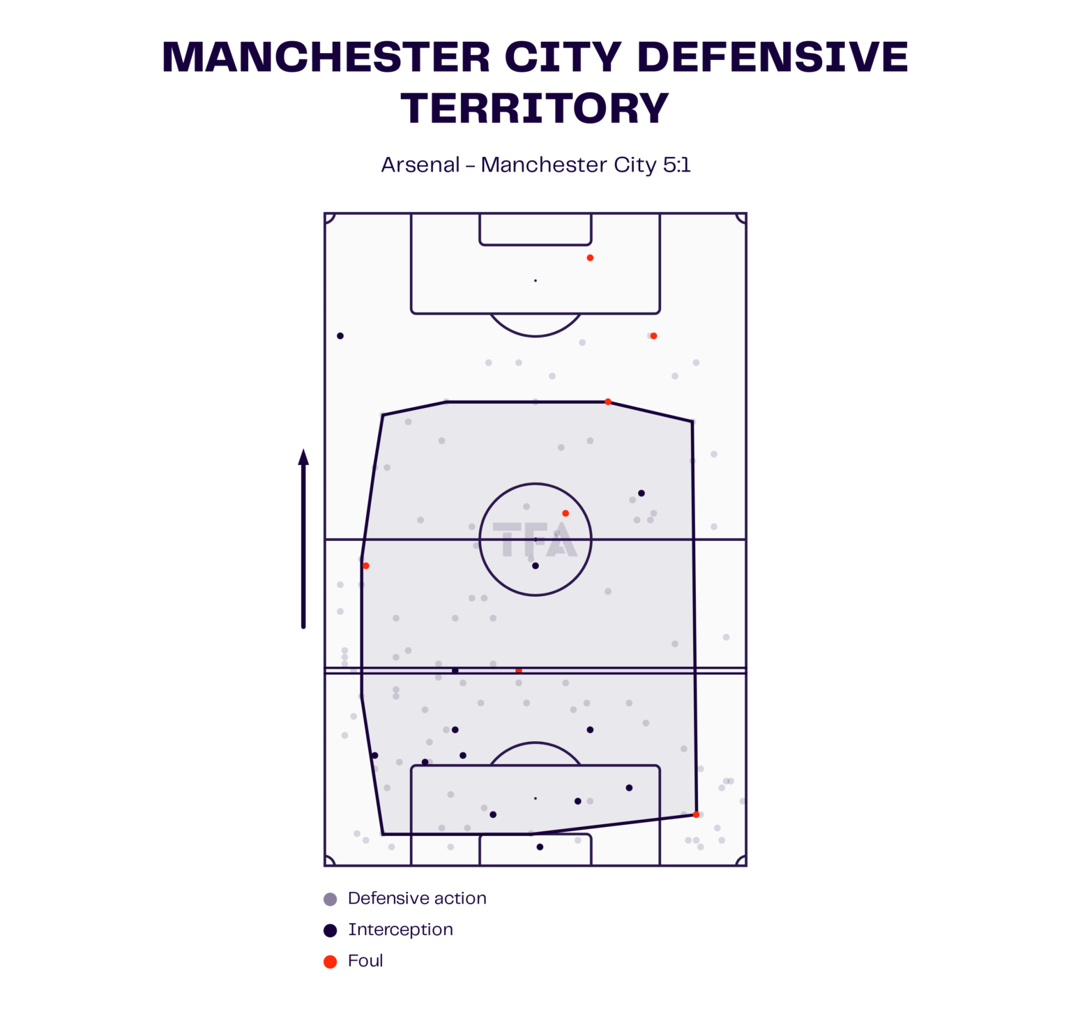 Потери мяча: полузащита «Сити» часто теряла мяч и контроль темпа/ритма - это приводило к тому, что «Арсенал» с легкостью возвращал себе инициативу. Потери нарушали ритм игры «Сити» и позволяли «Арсеналу» извлекать выгоду из переходов после возврата владения.