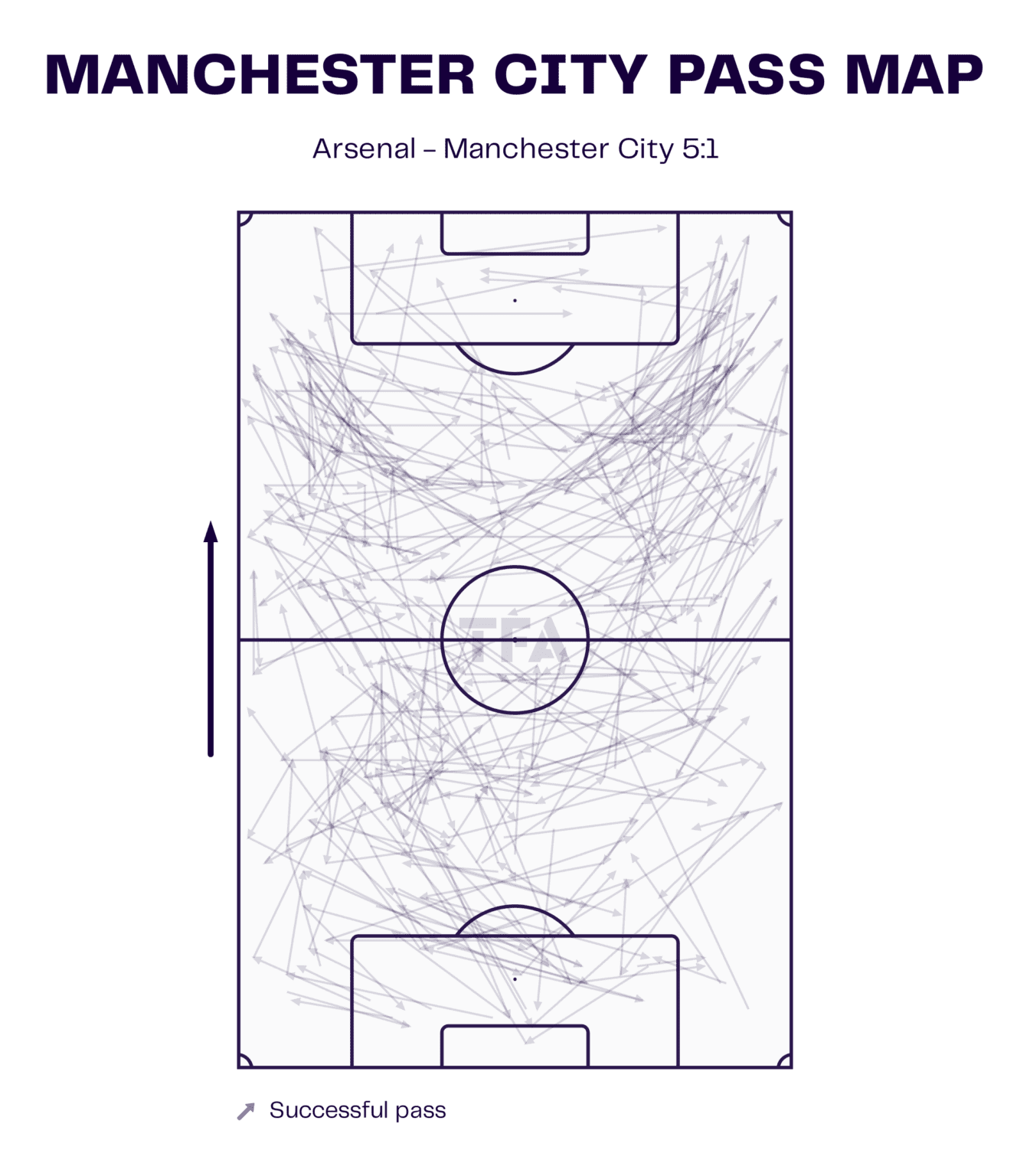 Отсутствие контроля: последовательность передач и индивидуальные розыгрыши указывают на то, что полузащита «Сити» с трудом удерживала контроль над игрой, особенно когда подвергалась давлению со стороны «Арсенала».