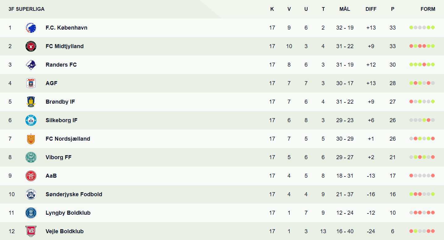 Действующий чемпион Дании не дает «Копенгагену» захватить лидерство в чемпионской гонке. Несмотря на то, что столичный клуб занимает первое место, у обеих команд одинаковое количество очков.