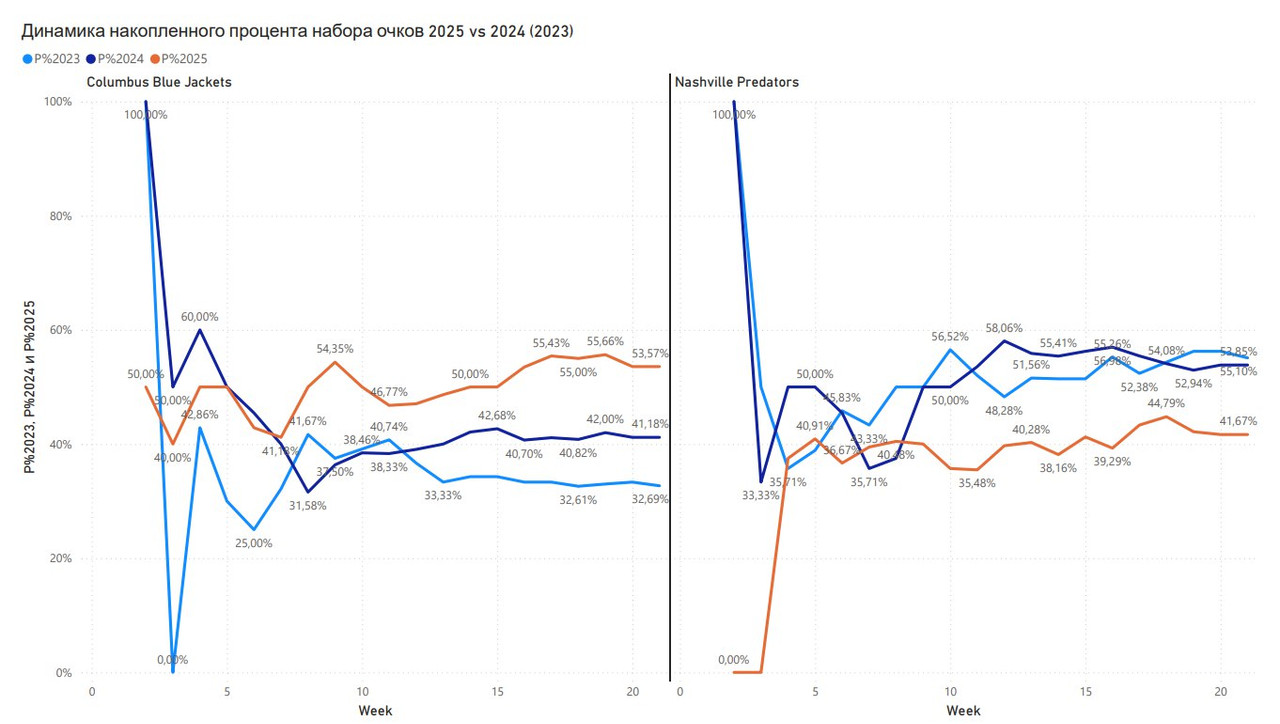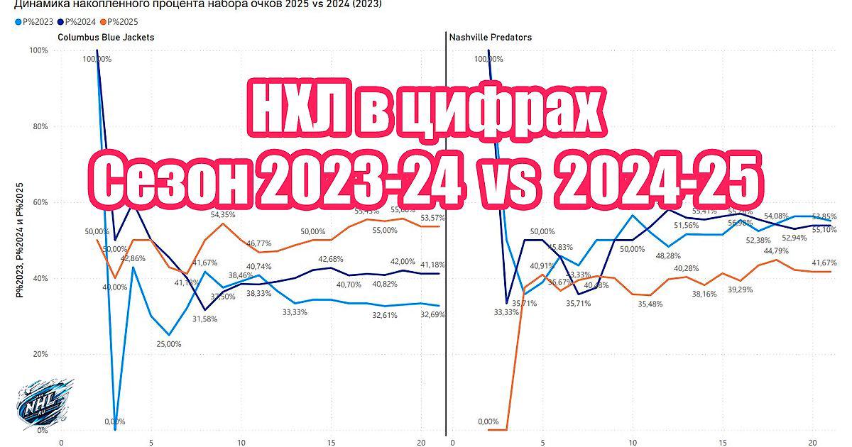 «Коламбус» прибавил, «Нэшвилл» буксует – но это просто срез сезона или тренд? Я посмотрел, кто реально изменился по сравнению с прошлым годом, и разобрал, что стоит за цифрами. Конкуренция на Востоке растёт, а на Западе всё скучно и предсказуемо. Почему «Блю Джекетс» полезли вверх, а «Предаторз» увязли, и может ли всё измениться во второй половине сезона? Давайте разбираться.