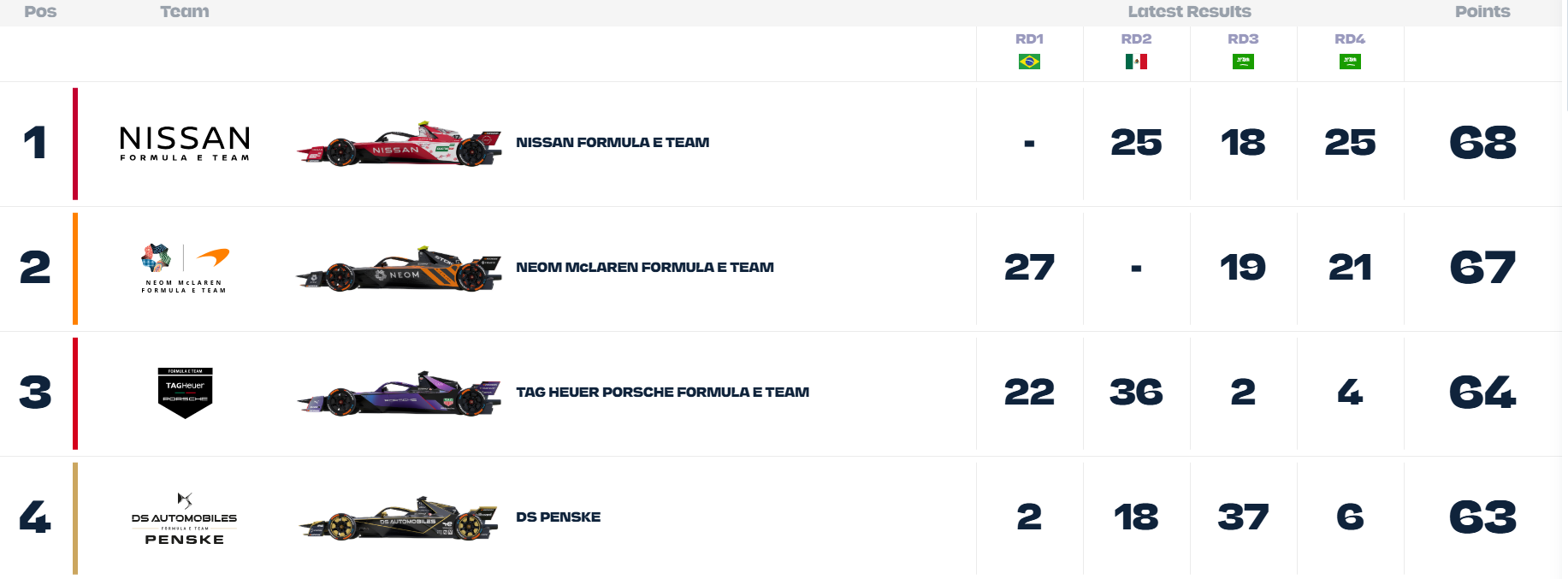 На старт нового сезона электрической «Формулы» вышло 11 команд: «Порше» (заводская), «Пенске» (альянс с концерном Stellantis), «Макларен» (на спонсорские деньги саудовской королевской семьи и с моторами «Ниссан»), заводской «Ниссан», заводская «Махиндра», заводской «Ягуар», заводской «Мазерати», частный «Андретти» (с миллиардерами-инвесторами и моторами «Порше» ), частный «Энвижн» (с моторами «Ягуара»), частная «Киро-Купра» (с инвесторами-звездами, поддержкой суббренда концерна «Фольксваген» и моторами «Порше»), и «Лола Ямаха» (альянс двух заводов и команды ателье «Абт», принадлежащей «Ауди».).