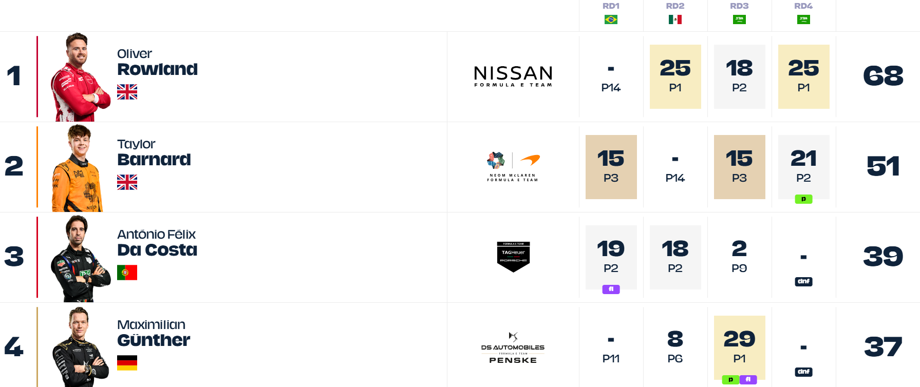 В командном заметно посвободнее − явный лидер, преследователь и остальные. И это притом, что Роулэнд провалил первую гонку нового сезона, а 20-летнй Барнард – вчерашний новичок из юниорок с одним сезоном в «Ф-2» и «Ф-3».