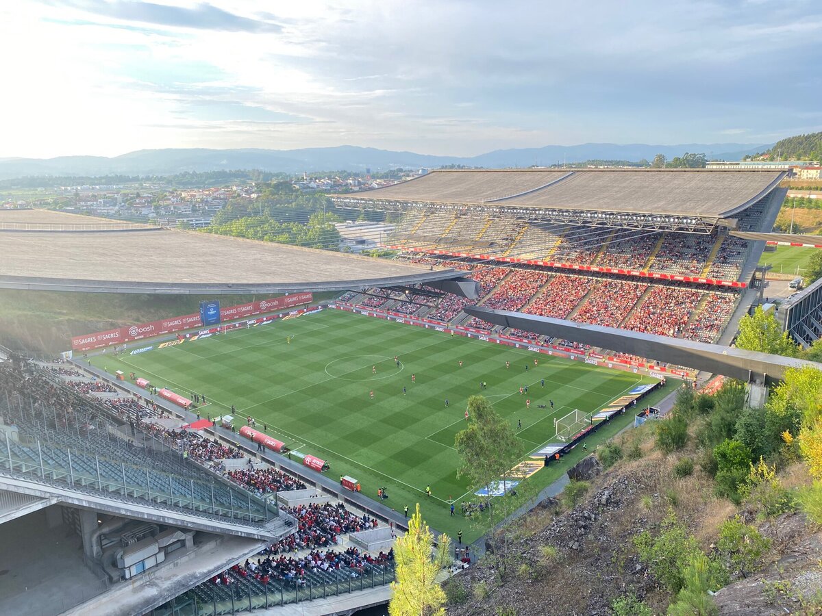 А ещё команда играет на одном из самых живописных стадионов мира. Арена «Брага Мунисипаль» была возведена к Чемпионату Европы 2004 года. Расположена она в нише, которая была специально выдолблена в горной скале. Вместимость стадиона составляет порядка тридцати тысяч, но трибуны здесь расположены только с двух сторон. Красоту всего этого пейзажа подчёркивает табло, в буквальном смысле слова подвешенное на скале, а также параллельные стальные канаты, стягивающие крыши двух трибун между собой. Ранее же клуб выступал на «Стадионе 1 мая», ныне использующегося резервной командой «Браги».