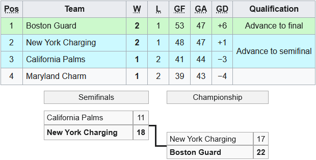 Победу в лиге 2025 года одержали представительницы Boston Guard, которые в финальном матче со счетом 22:17 одолели New York Charging. На третьем месте завершили состязания California Palms, на четвертом — Maryland Charm.