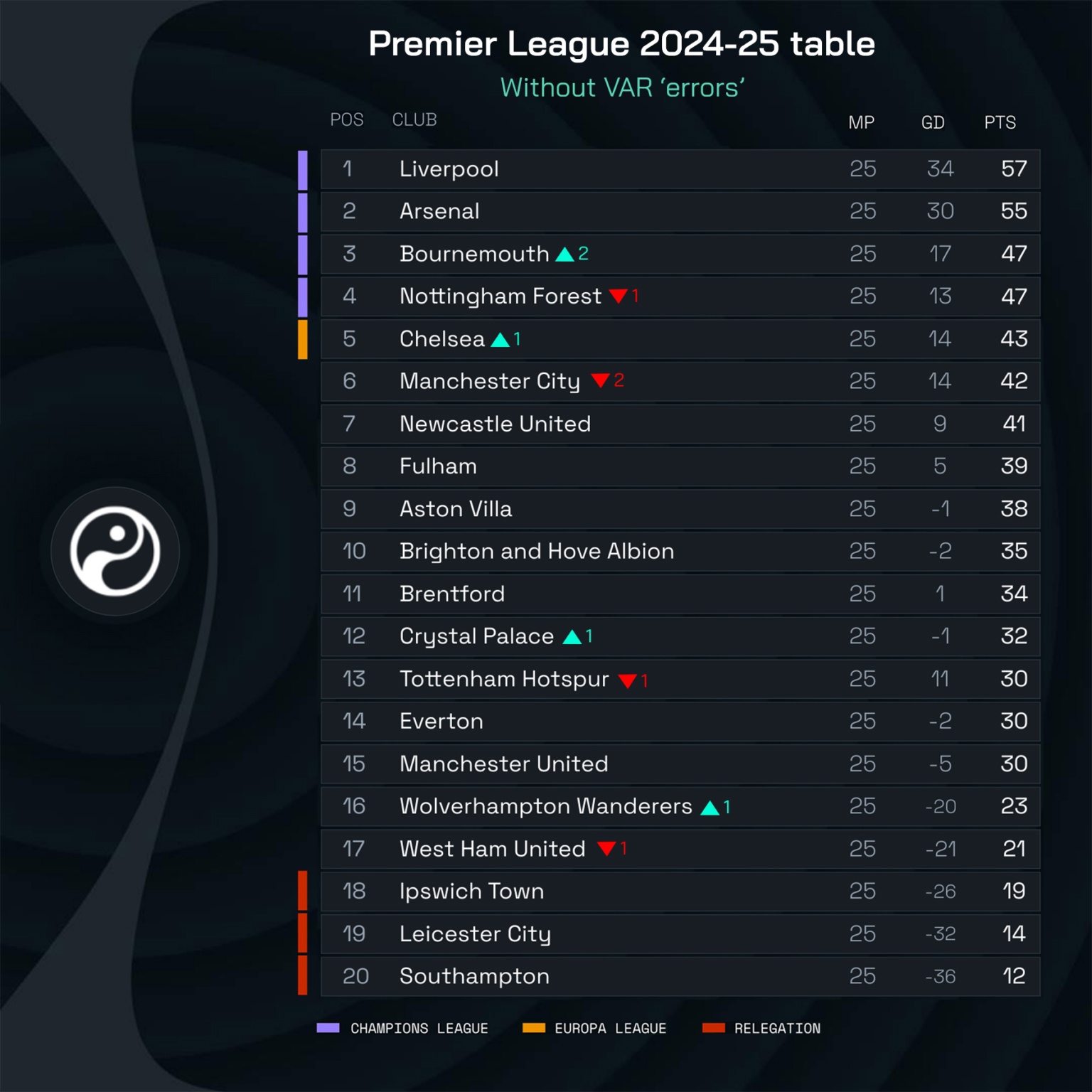 Портал Squawka, специализирующийся на футбольной статистике и аналитике, предположил, как могла бы выглядеть таблица Премьер-лиги после 25-ти туров, если бы VAR не допускал ошибок.