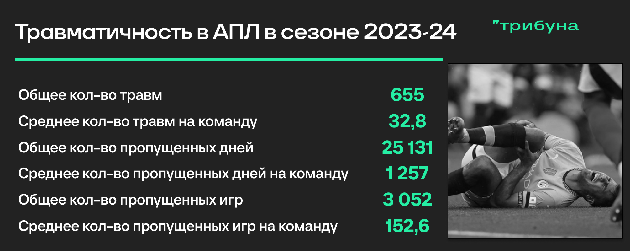 Если взглянуть на Чемпионат Англии, он превратился не в соревнование команд, а в соревнование медицинских штабов. Выигрывает тот, у кого меньше всего по сезону травм.