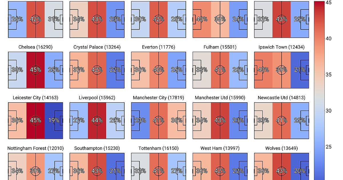 Если брать % соотношение, то получим 20% у Аморима и 19% до него, т.е., грубо говоря, на 100 касаний в финальной трети поля (вне штрафной) «Юнайтед» получит 20 касаний в штрафной соперника.
