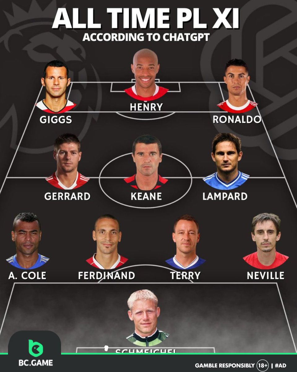 В команду легенд английского первенства по версии искусственного интеллекта вошли: Райан Гиггз, Тьерри Анри, Криштиану Роналду, Стивен Джеррард, Рой Кин, Фрэнк Лэмпард, Эшли Коул, Рио Фердинанд, Джон Терри, Гари Невилл и Петер Шмейхель.