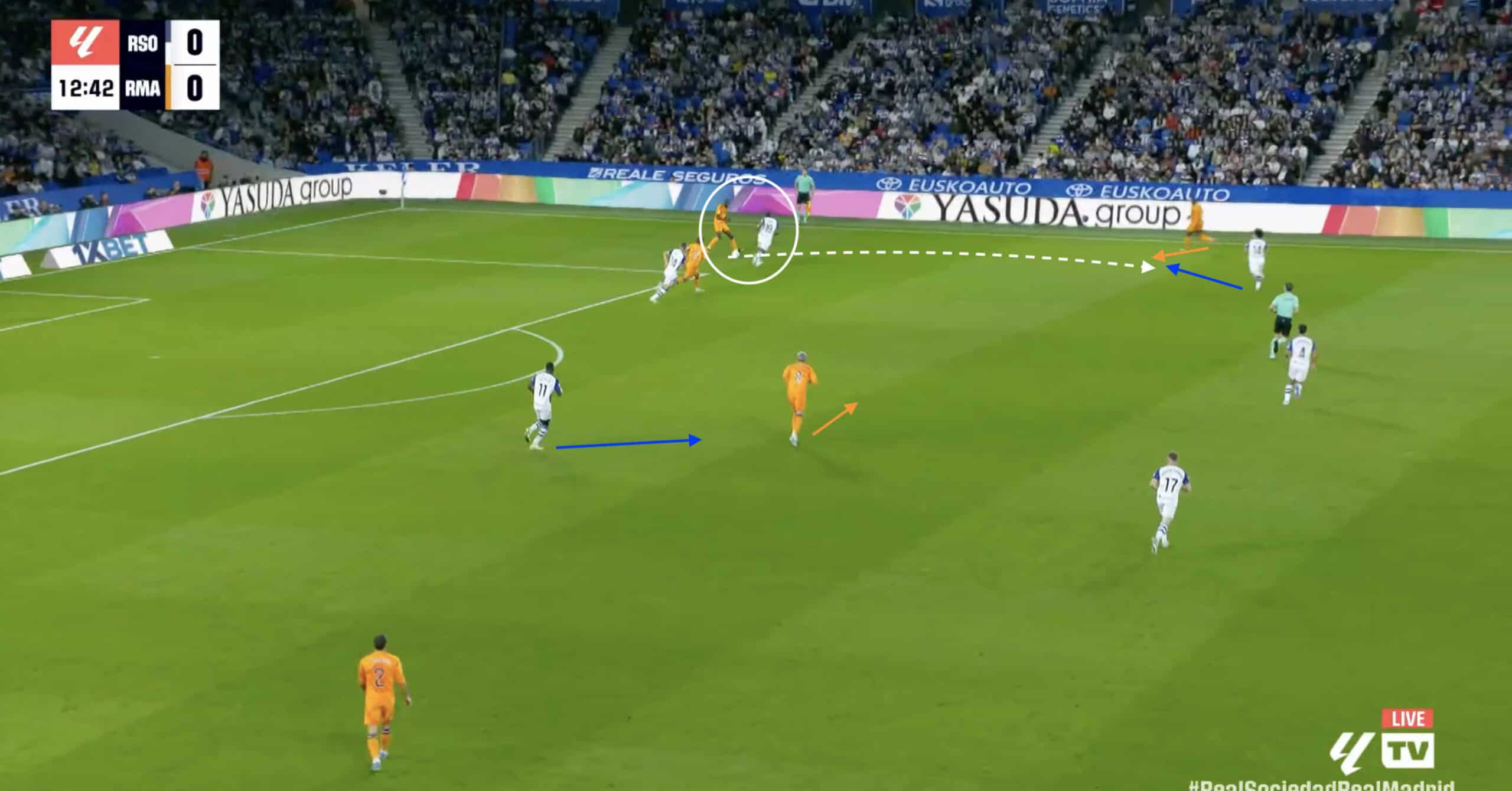 Но главное оружие «Сосьедада», благодаря которому функционируют все необходимые механизмы – это прессинг. С помощью него Альгуасиль как атакует, так и защищается. Именно с помощью постоянного, непрерывного давления Иманол смог ошарашить «Барсу» Флика в ноябре, не позволив ей даже пробить в створ. Точно так же он пытался играть против «Мадрида» в сентябре и ему это неплохо удавалось, но игроки не смогли наказать «Реал» за ошибки в начальной стадии.