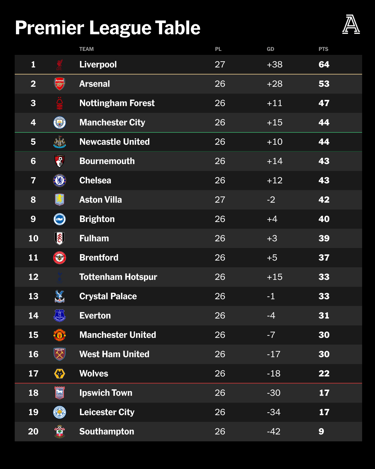 После 27 матчей у «Ливерпуля» 64 очков — на пять больше, чем у «Манчестер Сити» на аналогичном этапе прошлого сезона, и на шесть больше, чем у «Сити» на том же этапе победной кампании 2022/23 годов. Только пять раз в истории Премьер-лиги команда имела больше очков на этой стадии сезона.