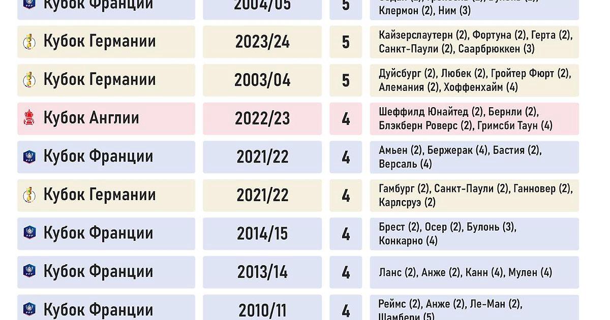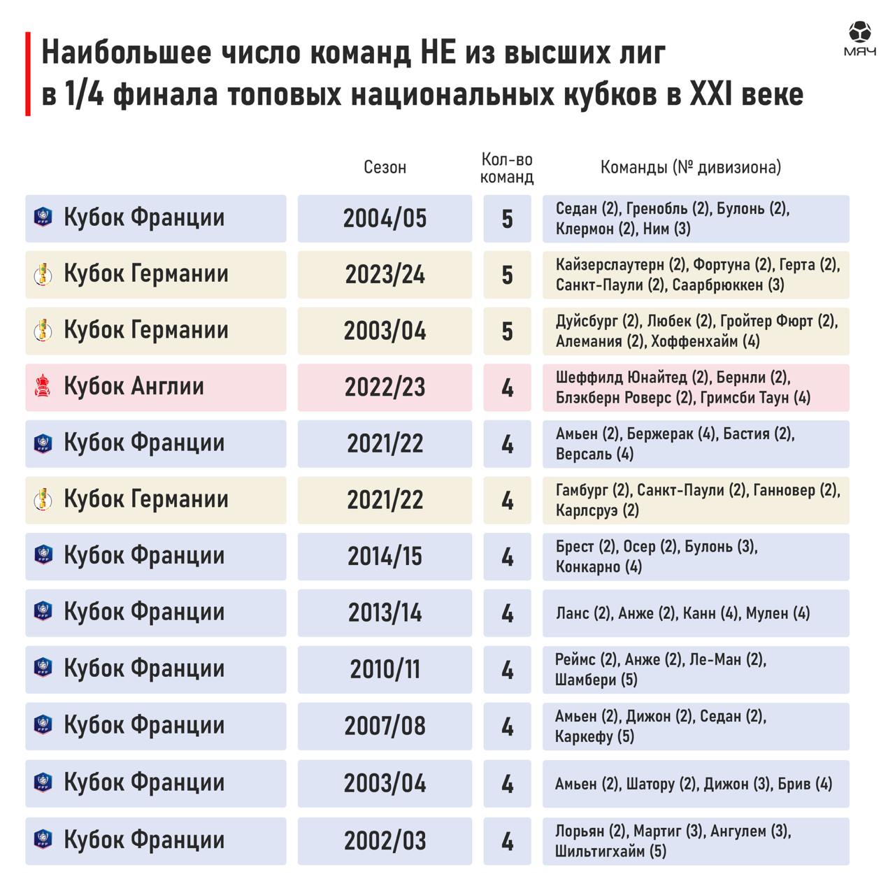 🇫🇷 В 1/4 Кубка Франции сыграет всего 4 клуба из вышки. Это антирекорд? В XXI веке французский кубковый турнир отличается наибольшим разнообразием участников на четвертьфинальной стадии. К примеру, три сезона назад в битве за полуфинал в очном поединке схлестнулись «Бержерак» и «Версаль», выступавшие аж в четвертом (!) дивизионе, а в розыгрышах-2002/03, 2007/08 и 2010/11 в 1/4 залетали и вовсе клубы из пятой (!) по силе лиги страны. Поэтому (два клуба из Лиги 2 и два из четвертого дива) не является каким-то особенным. Во-первых, потому что, например, 20 лет назад на данном этапе числилось 3 элитных команды, а, во-вторых, год назад в Германии в четвертьфинал вышли сразу 5 команд НЕ из Бундеслиги – «Кайзерслаутерн» и вовсе дополз до финала, где уступил «Байеру». Кубки же Италии и Испании можно назвать самыми бескомпромиссными – за последние 10 лет в 1/4 обоих турниров вышло суммарно по 4 НЕэлитных коллектива.