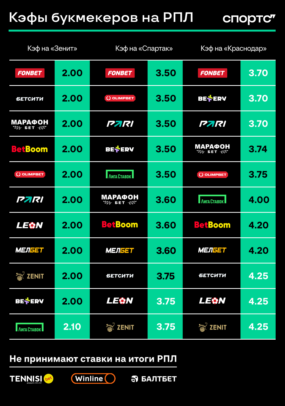 Любопытно, что «Бетсити», БК «Зенит» и «Леон» отличились по коэффициентам на «Спартак». Только три букмекера пока дают 3.75 на титул красно-белых, несмотря на мощные трансферы и идеальную серию в чемпионате до зимней паузы.