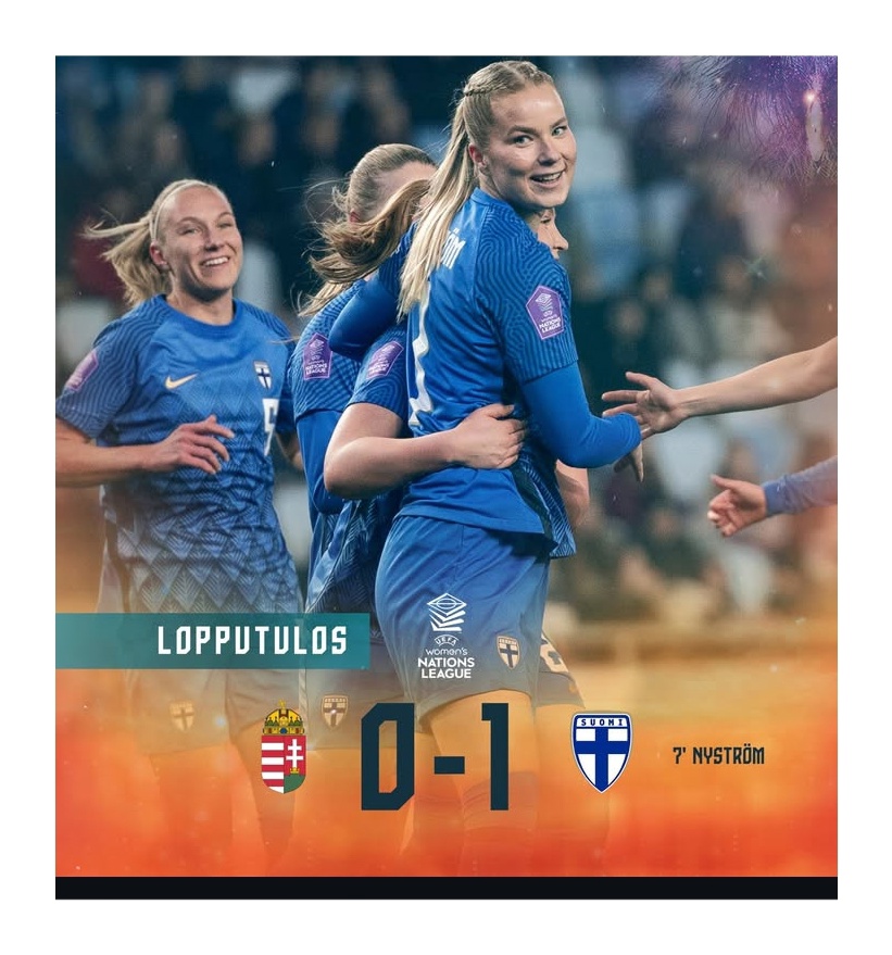 25 февраля состоялся второй матч женской национальной сборной Финляндии или, как их ещё называют, «Жемчужных сов» в 3-ей группе Лиги В в женской Лиге наций, в котором финская сборная встречалась со сборной Венгрии. Игра закончилась со счётом 0:1 в пользу Финляндии. Исход матча решил пенальти, назначенный в ворота венгерок в самом начале первого тайма. Пенальти за фол Луки Пап (ЖФК Волфсбург) на Аделине Енгман (ЖФК Комо Италия) реализовала защитник Эва Нюстрём (ЖФК Вест Хэм Юнайтед) на седьмой минуте матча.
