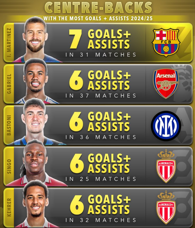Центральные защитники. Воздушная мощь «Барсы» Иньиго Мартинес помог уже с семью мячами. Гол в недавнем матче с «Атлетико» вывел его в лидеры, позволив опередить четверых ребят с шестью ассистами. Присутствие Габриэла и Бастони в этом списке не удивляет, а вот пара из «Монако» — восхищение: Вилфрид Синго и Тило Керер.