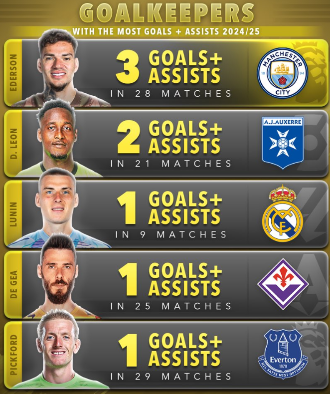 Вратари. Лидер вряд ли удивит — Эдерсон, у него аж три ассиста. Следом Донован Леон из «Осера» с двумя. Также отличались Пикфорд, Де Хеа и Лунин.