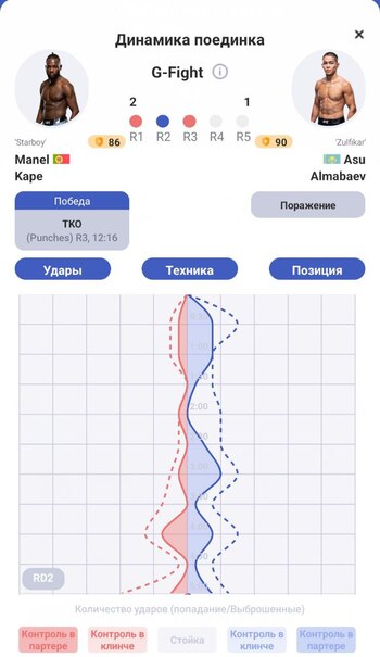 Во втором раунде Манель Капе еще с большей агрессией идет вперед, стараясь прессинговать казахстанского бойца и зажимать того у сетки. Алмабаев, понимая, что бой уходит у него из рук, решается сменить геймплан и начинает работать откровенно вторым номером – на отходах. И это дает свои плоды. “Зульфикар” попадает чаще противника и, возможно, прибирает раунд. Экран “Динамика поединка” в приложении Stats Fight показывает, что по эффективности атакующих действий Асу был чуть лучше Капе на данном отрезке.