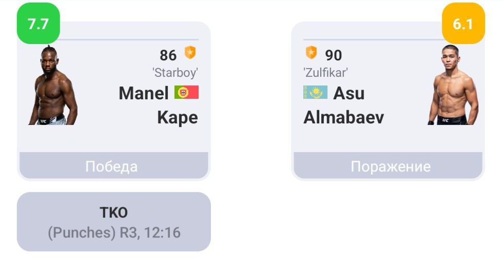 Алгоритм Stats Fight наделил Асу Алмабаева оценкой 6.1 за выступление в бою с Капе. Манель, в свою очередь, получил рейтинг 7.7 – это говорит о том, что португалец эффективнее применял свой технический арсенал в минувшем поединке.