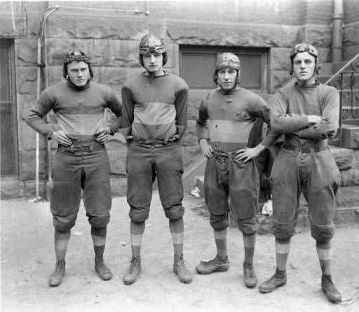 1920 год: Фотография четырех членов футбольной команды колледжа Святого Томаса. Слева направо Леонард Макговерн, Джеймс Иген, Дэн Макдевитт и Николас Хельринг