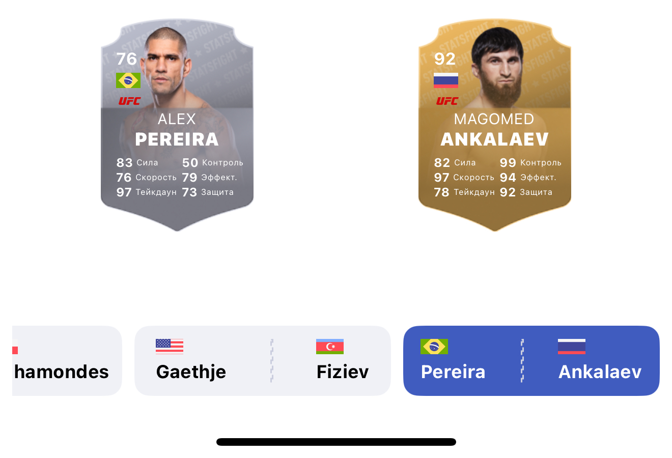 По данным Stats Fight Rating, бойцовский уровень Магомеда Анкалаева выше, чем у Алекса Перейры. Навыки российского файтера оцениваются рейтингом 92. Что касается бразильца, то его характеристики наделены рейтингом 76.