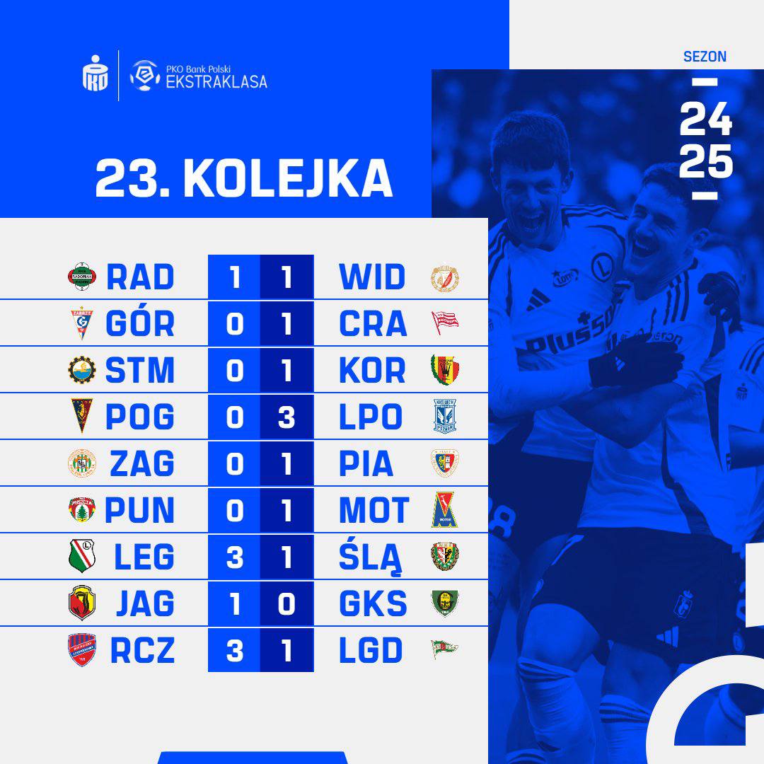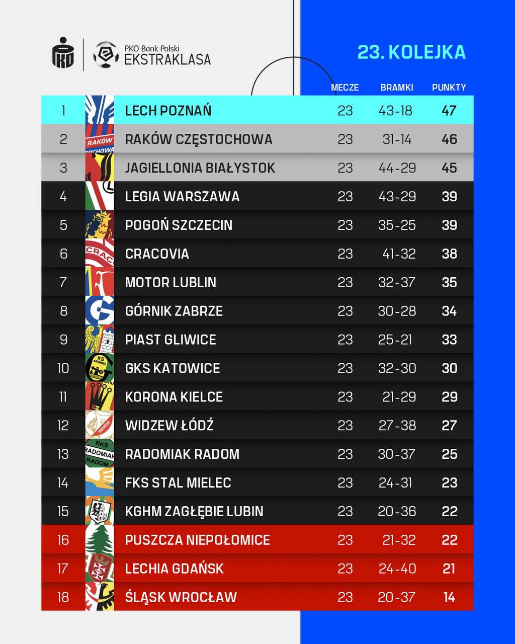 В прошедшие выходные прошел 23-ий тур Экстракласы. В отличие от 22-го тура, этот подарил меньше сенсаций – лидирующее трио в лице «Леха», «Ракува» и «Ягеллонии» синхронно победили в своих матчах, а из аутсайдеров очки почти никто не набрал.