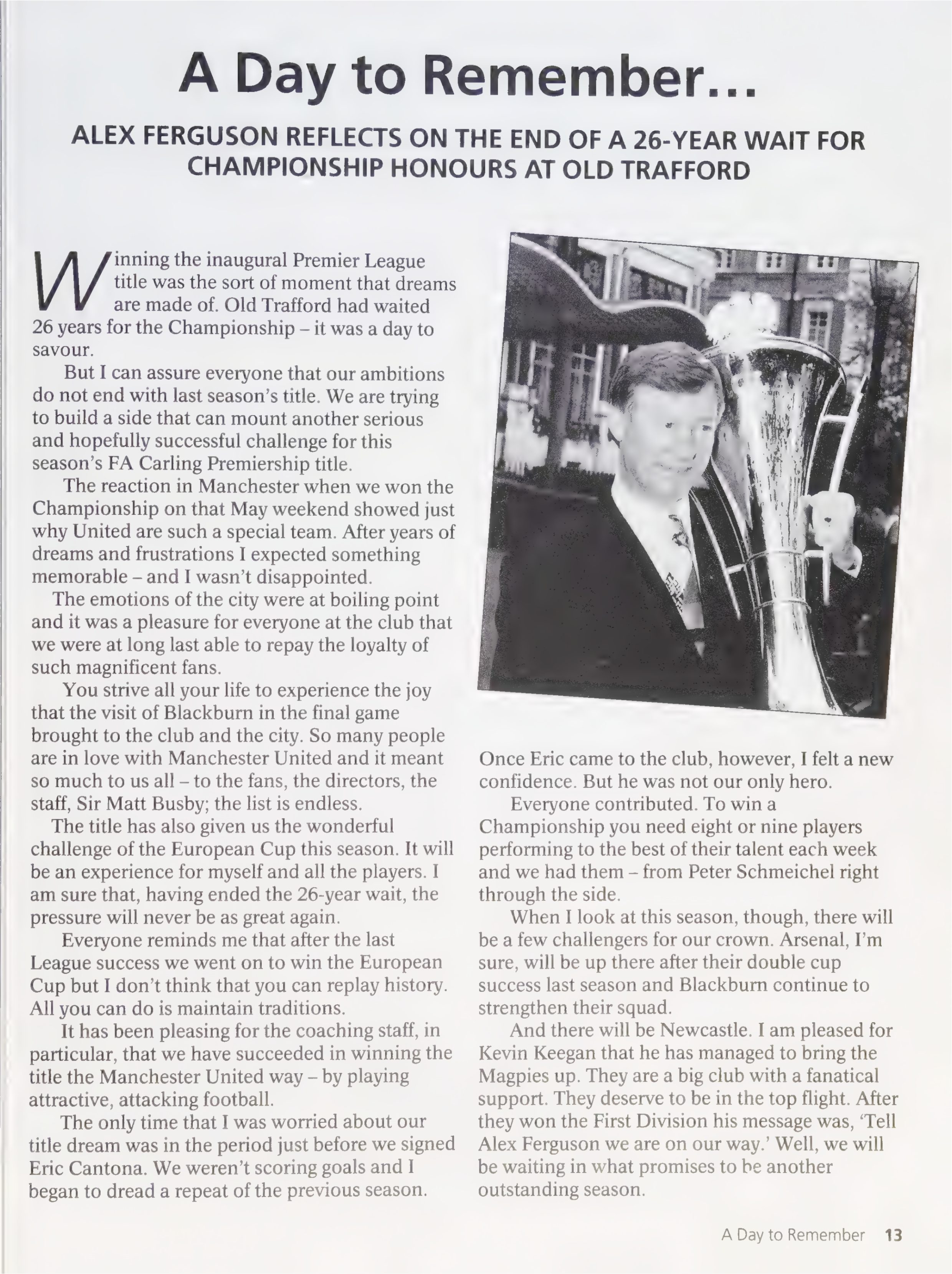 В самом начале есть колонка Фергюсона, посвященная победе его команды в чемпионате — впервые за почти три десятка лет. Ниже — перевод колонки.