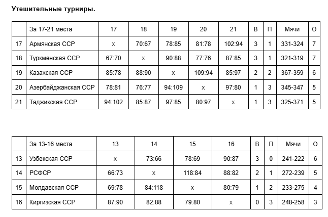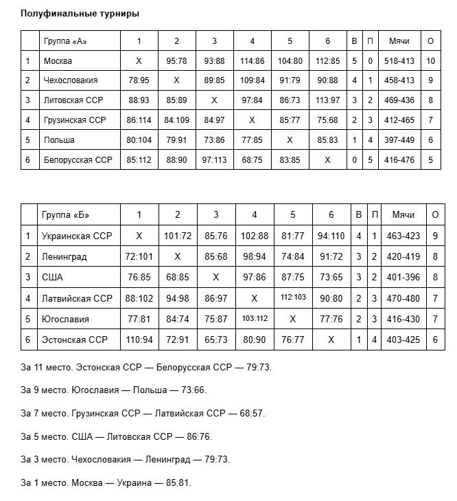 В группе «Б» Украина (9 игроков из «Строителя», 3 из киевского СКА) прошла по очереди Латвию – 102:88, Ленинград – 101:72, США – 85:76, Югославию – 81:77, стала досрочно победителем, и в последний день уступила Эстонии – 94:110. Американцы, проиграв в первый же день Ленинграду – 68:85, в итоге остались на третьем месте. Жаль. Команда по ходу турнира набирала сыгранность, и было бы интересно посмотреть, как Херб Уильямс, Джефф Лэмп, Эндрю Тоуни и, особенно, Джо Барри Кэррол сыграли бы против Москвы в финале.