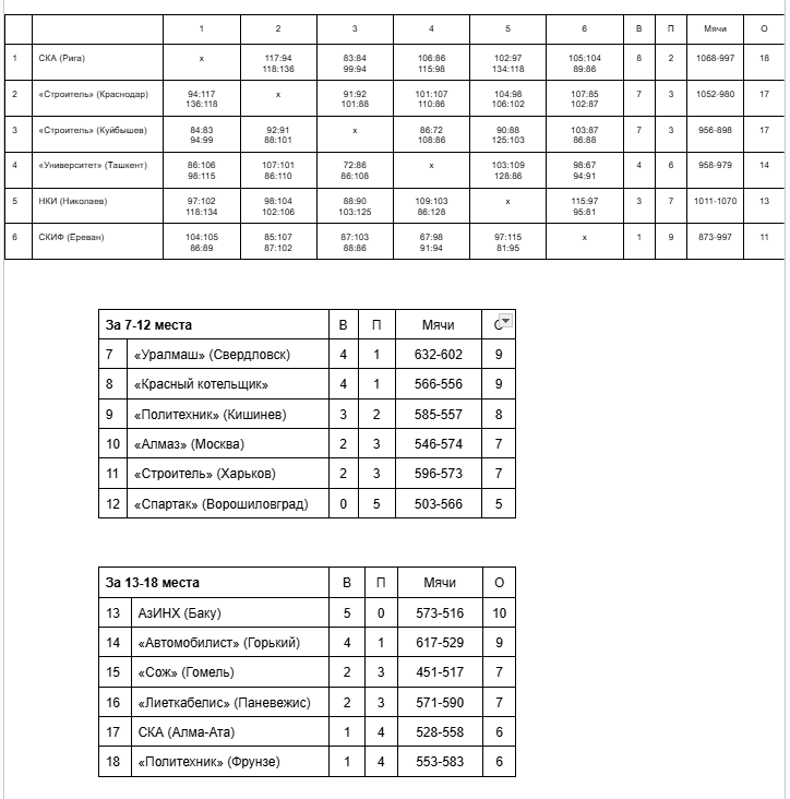 РТИ, выиграв у ВЭФа – 102:94, впервые в своей истории поднялся на шестое место! Шереверя, Попков, Гузик, Акимов, Кравченко и их партнеры проиграли в Киеве (как и ЦСКА) только «Строителю». А тот дома вообще не знал поражений и заслуженно стал вторым призером (четвертый раз в своей истории). Московскому «Динамо», которое долгое время шло вровень с лидерами, немного не хватило до медалей. Если бы после тура в Вильнюсе не сорвался с режима Дворный, кто знает, как все сложилось бы…