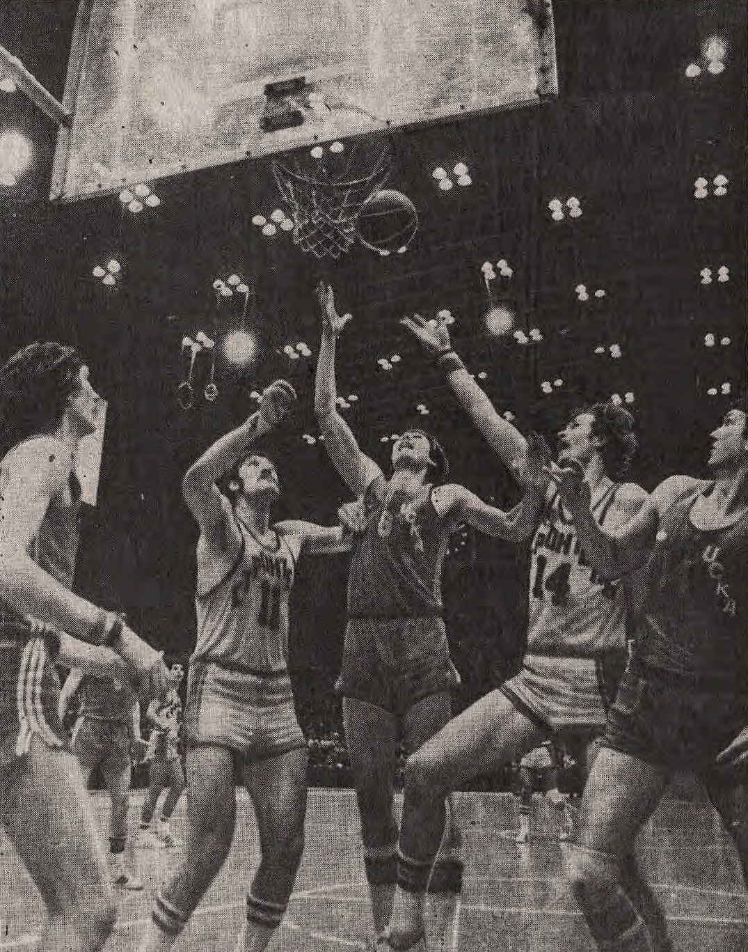 6 февраля 1979. Киев. Центровые «Строителя» Владимир Ткаченко (№ 11) и Александр Белостенный (№ 14) (на снимке они против армейцев Анатолия Мышкина, Андрея Лопатова и Евгения Коваленко) обеспечили команде победу над ЦСКА – 96:84. Теперь уже ничто не могло остановить киевлян на пути к серебряным медалям