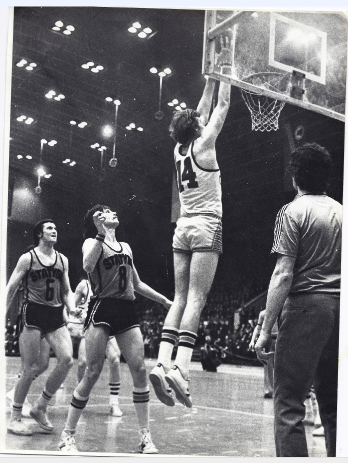 4 февраля 1979. Киев. Центровой «Строителя» Александр Белостенный, опережая Эдмундаса Нармонтаса (№ 6) и Альгимантаса Павилониса, очередной раз поражает кольцо «Статибы». После этой победы (85:84) киевский клуб вышел на второе место