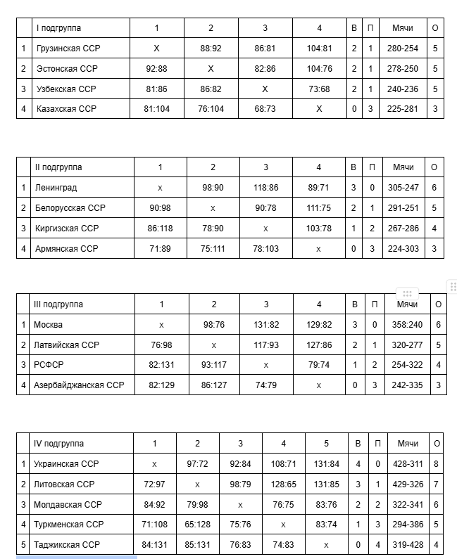 Второй этап прошел по той же схеме, только состав шестерок немного поменялся. В Вильнюсе (17-22 января) играли ЦСКА, «Статиба», московское «Динамо», РТИ, киевский СКА, «Жальгирис», в Ленинграде (18–23 января) – оба «Спартака», тбилисское «Динамо», «Калев», «Строитель» и ВЭФ. Потом все собрались в Киеве и со 2 по 8 февраля доиграли чемпионат. На этом – все.